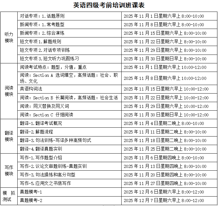 英语作为国际交流的重要工具,在教育和职业发展中扮演着越来越重要的角色。大学英语四、六级考试(CET-4/6)不仅是衡量大学生英语水平的重要标准,也是许多企事业单位招聘时参考的重要指标之一。 为帮助广大学生顺利通过大学英语四、六级考试,提升英语综合应用能力,广西大学雷速体育特别推出“大学英语四、六级考前培训班”。该项目旨在为应考学生提供系统化、个性化的学习方案,为顺利通过考试助力。 【培训目标】 帮助学员掌握大学英语四、六级考试的核心知识点和解题技巧。 提升学员在听力、阅读、写作及翻译等各方面的应试能力。 助力学员备考大学英语四、六级,取得理想成绩。 【培训内容】 听力专项:强化训练,习得技巧,提升分数 阅读专项:打破传统,掌握方法,争取高分 写作专项:活用模板,巧用句型,优化结构 翻译专项:逻辑转换,转变思维,着重产出 测试点评:全真试题,定位短板,科学提升 【培训对象】 1.广西大学在读本科生和研究生; 2.南宁市内高校在读本专科生和研究生。 【培训方式】 线上线下混合教学:线上平台提供丰富的教学资源,方便学员随时复习和练习重点知识;线下课堂开展面授教学,包括知识点讲解、小组讨论、课堂练习等。 小班教学:每班学员控制在30人左右,确保教师能够关注到每位学员的学习情况,提供个性化指导。 【培训时间】 培训周期为5周,共48个课时,每次课50分钟。课程主要安排在周末及课余时间。计划2025年11月1日开课,12月7日结课。 【收费标准】 大学英语四级考前培训班:1580元/人/期。 大学英语六级考前培训班:1880元/人/期。 【联系方式】 咨询报名热线:0771-3235605 李老师 报名地址:广西大学雷速体育210办公室 咨询二维码 报名二维码