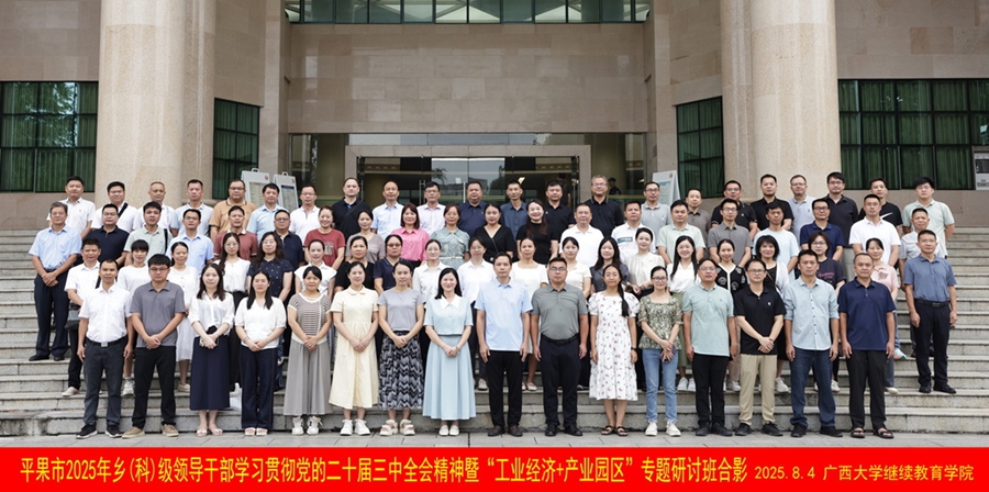 8月4日,平果市2025年乡(科)级领导干部学习贯彻党的二十届三中全会精神暨“工业经济+产业园区”专题研讨班在我校开班。中共平果市委组织部部务会成员、市党员教育中心主任陆香兰,广西大学雷速体育干部培训中心李文副主任出席开班式并讲话。