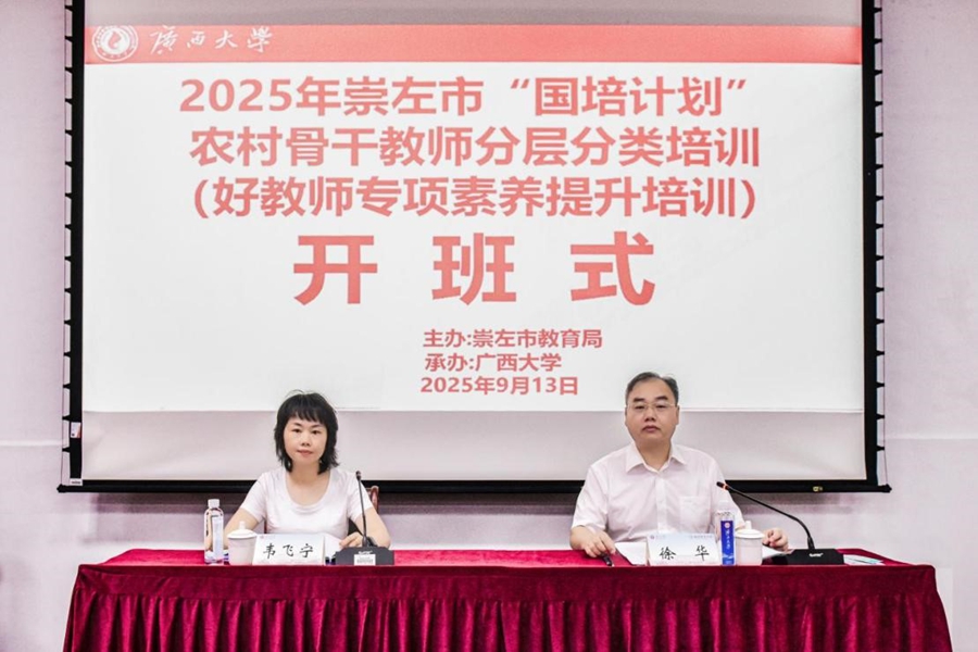 为深入贯彻落实国家关于新时代教师队伍建设改革的决策部署,提升崇左市教育系统教师的专业能力与综合素养,9月13日,由崇左市教育局统筹、广西大学承办的2025年崇左市“国培计划”农村骨干教师分层分类培训班(好教师专项素养提升培训班)在我校开班。广西大学雷速体育副院长徐华出席开班式并讲话,广西大学雷速体育副教授范小俊主持开班式。